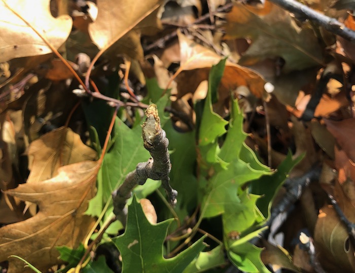 I haven’t watched her do this, but I know that she’s there because of the nip twigs. (Nip twig is an official term. Almost as good as porcupette!) The base of oak tree #4 is littered with nip twigs.