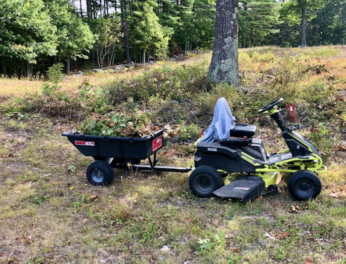 Once a year I mow the field to keep saplings and invasive roses from taking over. I’ll do that after the first frost. Before then, I have to clear up Po’s mess. My little electric mower can’t handle nip twigs. Especially not the quantity and size that Po has been throwing down! So far, I’ve filled the dump cart up twice.