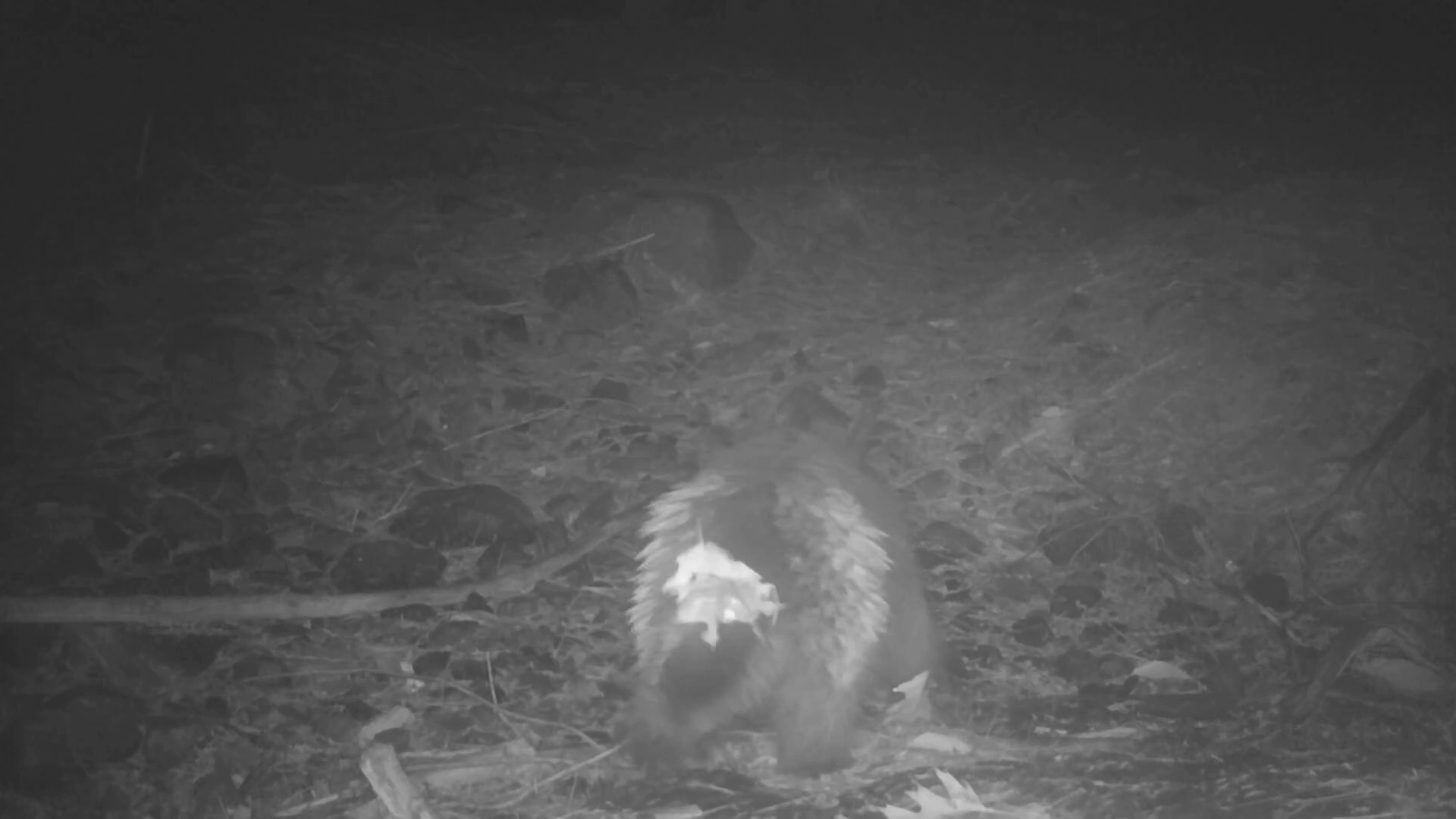 By the end of August Po had moved on from oak tree #1. Occasionally we’d see her at night (porcupines are mostly nocturnal) foraging in the backyard, and we captured images of her on the wildlife cam that we have set up in the woods. I particularly like this screen shot of her plodding along with a leaf stuck on a quill.