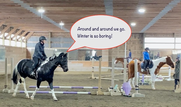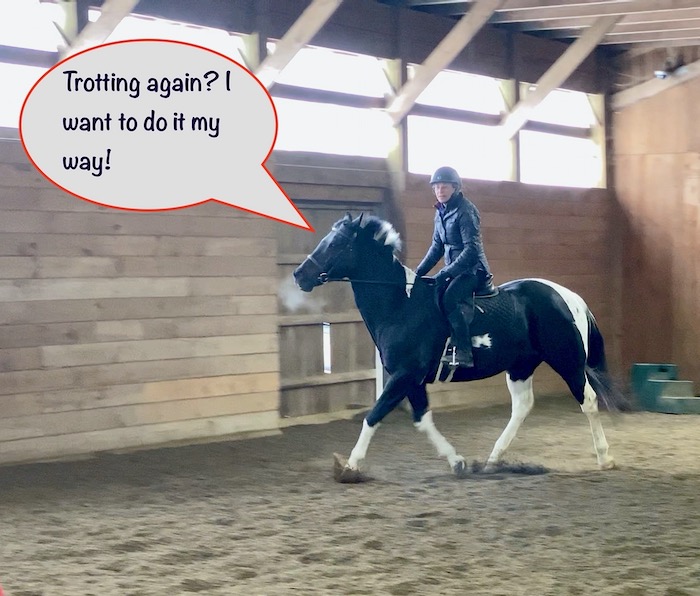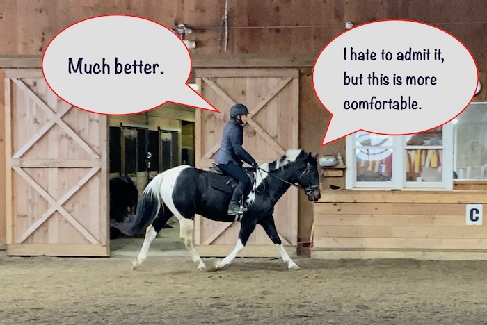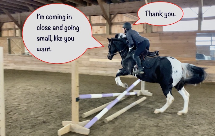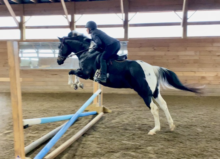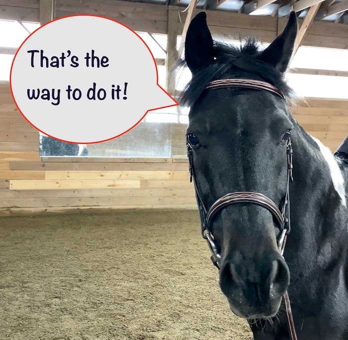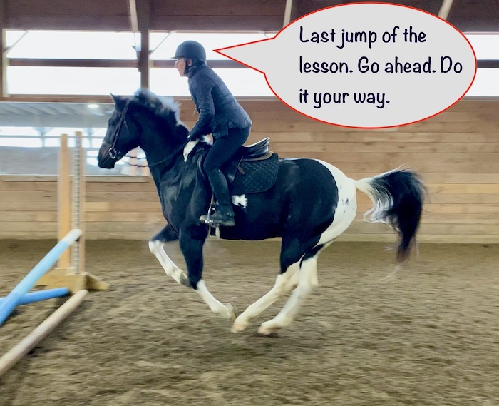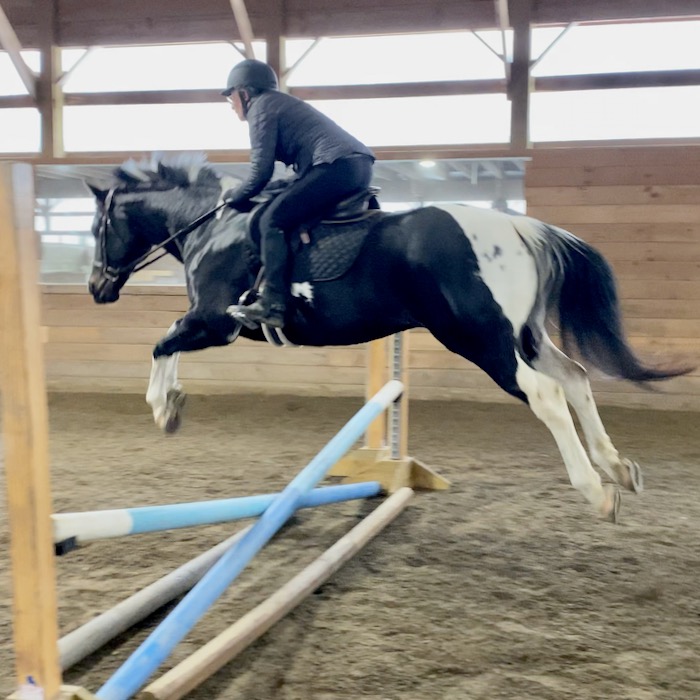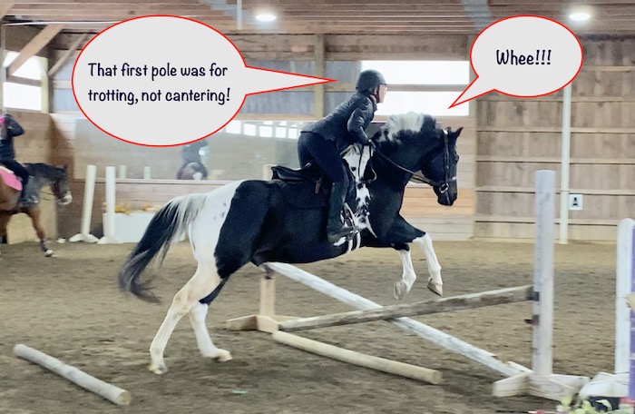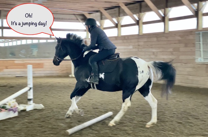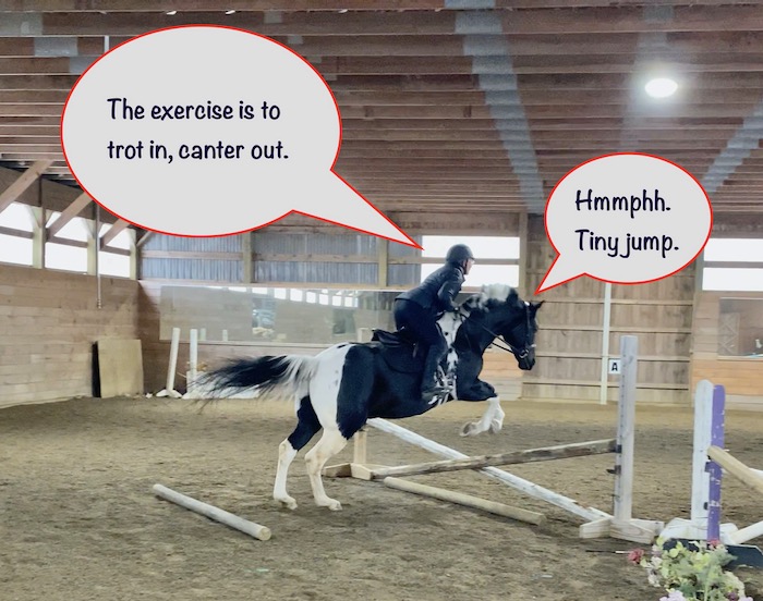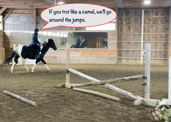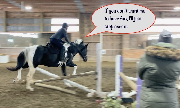 Tonka and I continue to learn to jump as a team. I listen to our trainer, Steph, and then try to convey her advice about how to approach the obstacles to Tonka, but he has his opinions about the best way to do it. When Tonka gets frustrated, his way of going solo is to jut his under neck out to avoid listening to me. In our last lesson I let him know that this was unacceptable. If he wanted to go like a camel, then we’d trot past the jumps, not go over them. That changed his mind rather quickly! Here’s how it went: